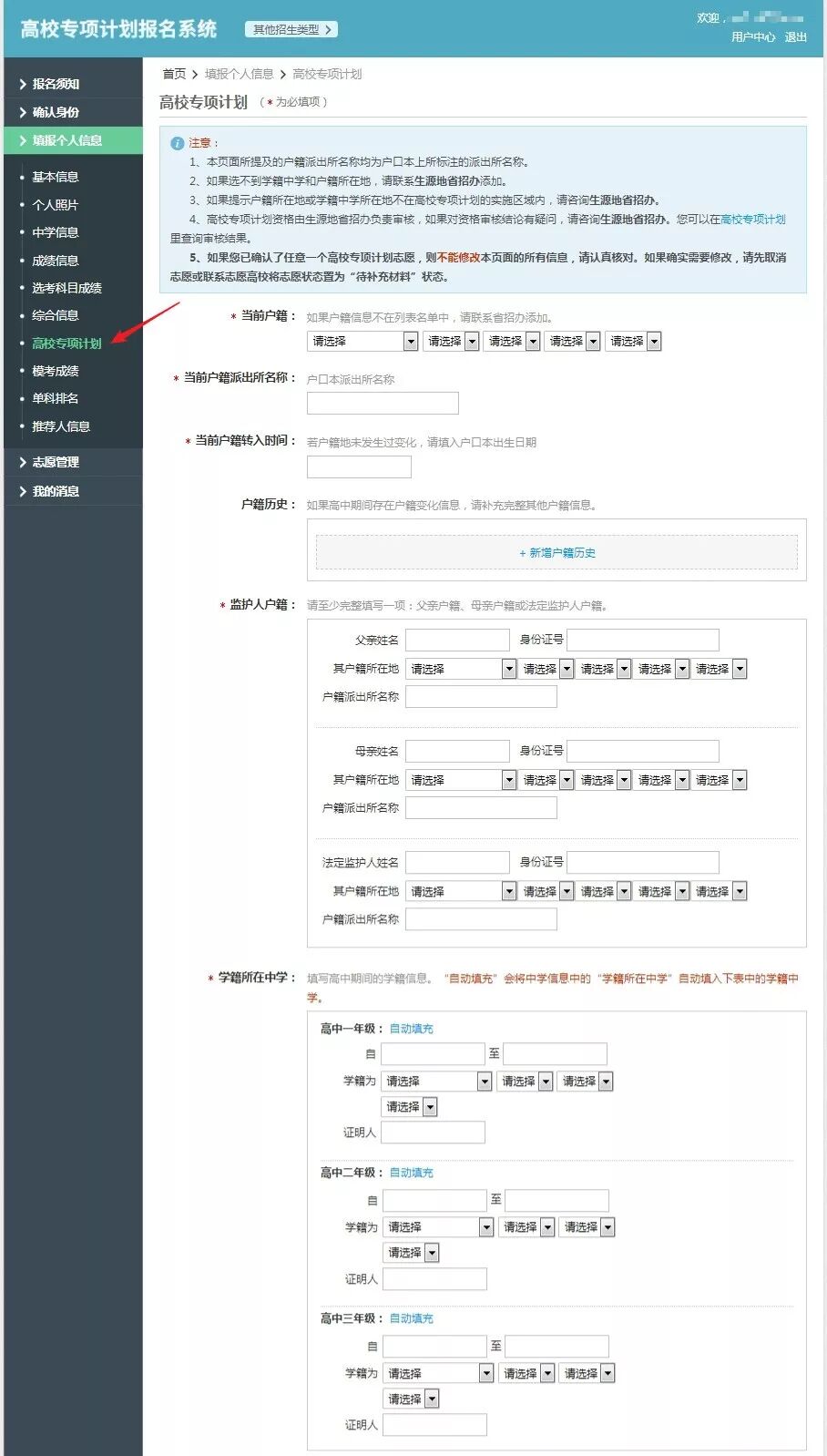▲ 高校专项计划报名系统内页