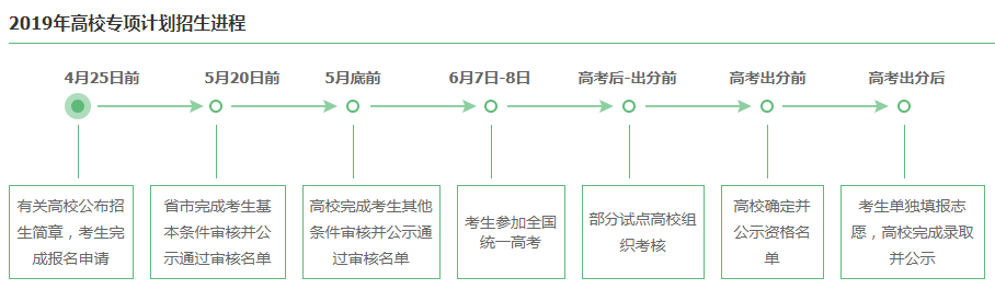 获得高校专项计划认定的考生也须参加高考,单报志愿、单独录取,在本科一批开始前完成录取,录取分数原则上不低于有关高校所在批次科类录取控制分数线。志愿填报方式、填报时间等以当地省级招生考试机构规定为准。 顺便为大家科普一下高校专项计划的招生进程: